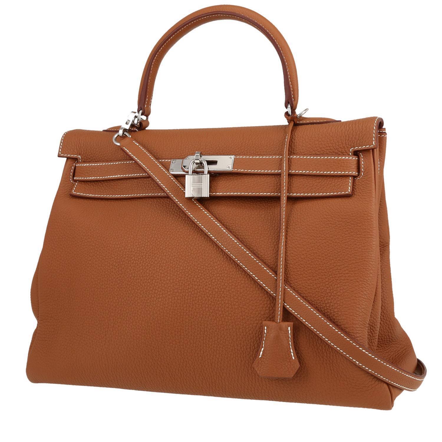 Magnificent Hermès Kelly 35 cm handbag in gold togo leather, hardware in palladium metal, simple handle in gold leather, gold leather removable strap to be worn accross the body allowing the bag to be worn in the hand or on the shoulder.