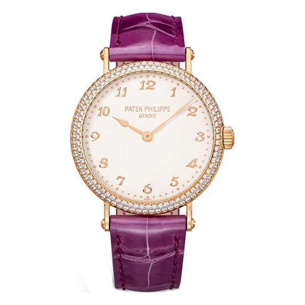 Patek Philippe Calatrava 7200/200R-001 Studded Silver Dial Diamond-Set Bezel 34.6mm 18kt Rose Gold Royal Purple Leather Straps Ladies Watch sold by .