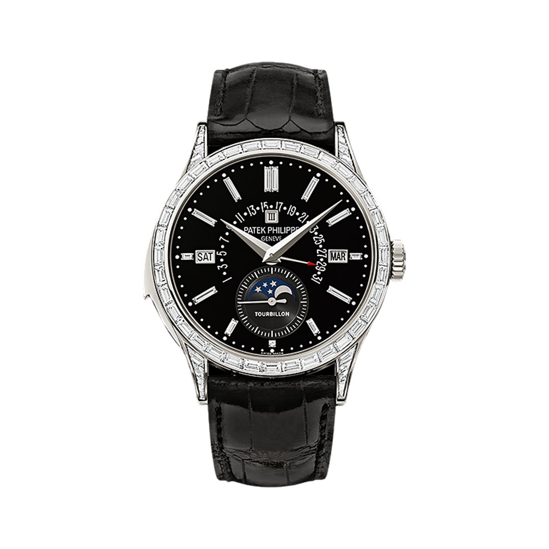 Patek Philippe Grand Complications 5217P-001 Perpetual Calendar Moon Phase Platinum Baguette Diamond Bezel Black Dial 39.5mm Men’s Watch –