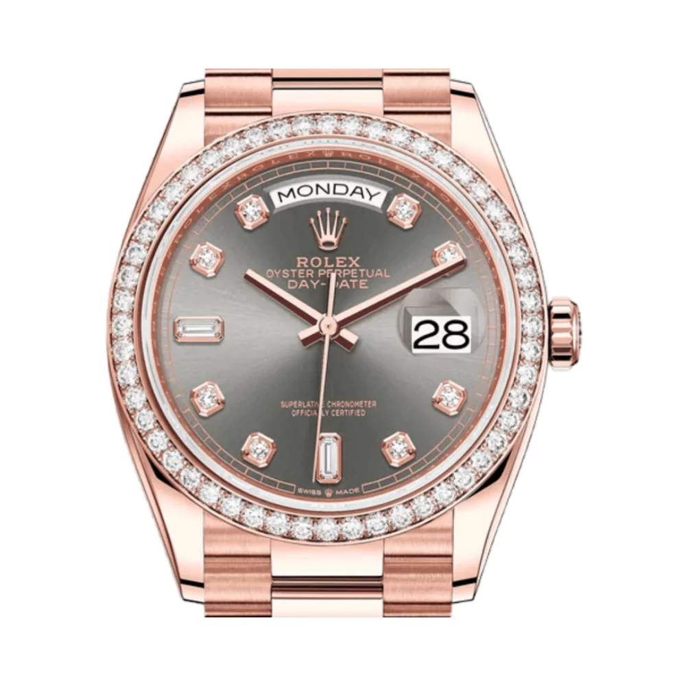 Elegant Rolex Day-Date 36 President with diamond bezel, gray dial, and Everose gold case for classic luxury…